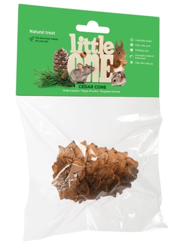 Cederkoglen er et fantastisk stykke naturlegetøj til små kæledyr. Når dyret knaser i koglen, hjælper det den naturlige tandslibning – samtidig med at de næringsrige pignolia-nødder inde i koglen giver et lille, velsmagende supplement. Pignolia indeholder naturlige antioxidanter, vitaminer og mineraler, og koglen er skånsomt tørret med en særlig teknik, der markant reducerer tjæreindholdet. Resultatet er en ren, sprød og aromatisk kogle, der aktiverer, stimulerer gnaveinstinktet og beriger hverdagen i buret.