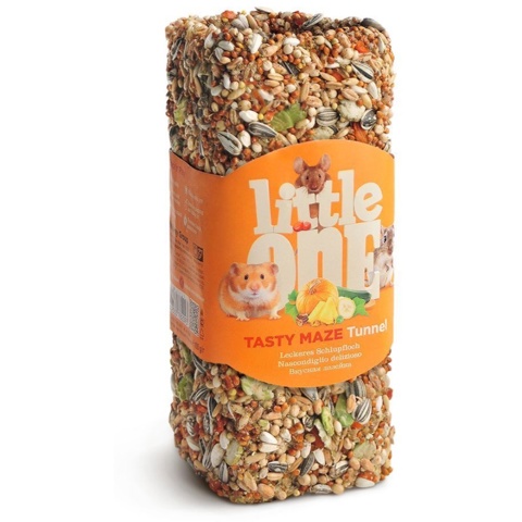 <h2>En velsmagende godbid hvor gnaveren kan gemme sig</h2><p>Little One Tunnel Tasty Maze er en sjov snack til dine gnavere, for snacken indbyder til at lege, gemme sig eller tage en lur. Derudover vil den berige kosten med gavnlige vitaminer og mineraler. Produktet indeholder puffede korn, tørrede frugter og grøntsager.</p>