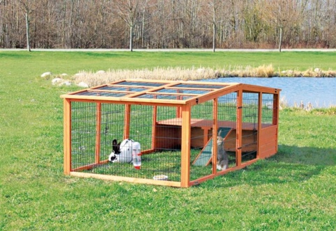 Rummelig løbegård, der giver kaninerne masser af plads til at hoppe og løbe. Trådgitter på sider og låg sikrer god ventilation og forhindrer, at dyrene stikker af. En hævet repos giver vejrbeskyttet ly, og en rampe gør det nemt for kaninerne at bevæge sig mellem niveauerne. Låget er delt i to halvdele, som kan åbnes separat ovenfra – den ene halvdel kan lukkes som ekstra beskyttelse mod vejret. I alt tre døre giver fleksibel adgang: to små sidedøre samt en aftagelig dør, der gør rengøring og håndtering enkel.