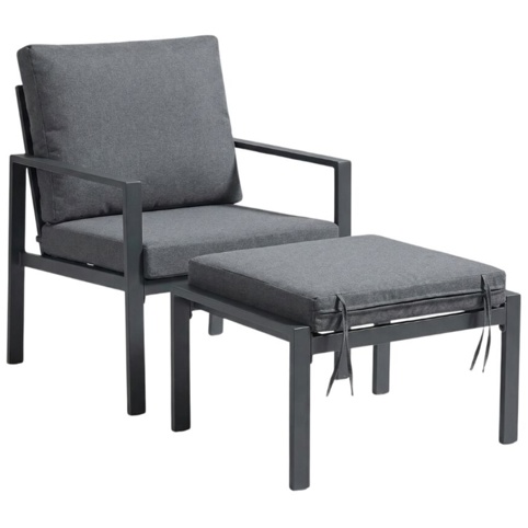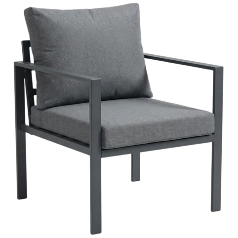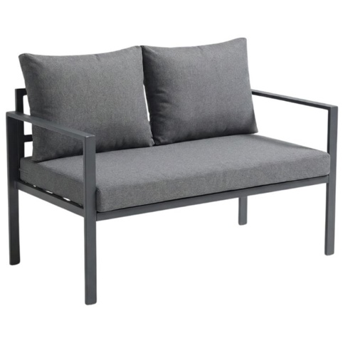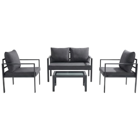 Dette stilrene loungesæt består af 4 dele: en 2-personers loungesofa, 2 stole og 1 bord. Bordpladen er fremstillet af 5 mm glas med silketryk. Dimensionerne på 2-personers loungesofaen er H:70 cm x B: 58 cm x D: 65, og bordet måler L: 60 cm x B: 40 cm X H: 38 cm. Stolene måler: H: 108 cm x B: 65 cm x D: 70 cm. Loungesættet er i farven sort, og hynderne er farven grå – hynderne er fremstillet af polyester. Du kan f.eks. tilføje farverige tæppe og puder.