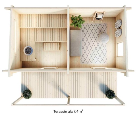 Luoman Kihu er den slags havesauna, der hurtigt bliver et fast ritual: En stille stund, hvor tempoet falder, og der er plads til at trække vejret helt ned i maven. Planløsningen er lavet, så du får en mere afslappet oplevelse: ét rum til selve saunadelen og ét rum til omklædning/ophold, hvor der er plads til at sætte sig med et glas vand, lægge ekstra håndklæder frem og gøre det hyggeligt med små detaljer. Terrassen fungerer som en naturlig forlængelse, hvor du kan sidde i læ, tage en pause mellem varmegange og skabe dit helt eget lille fristed i haven. Ovn og skorsten medfølger ikke.