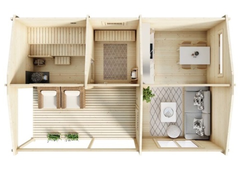 Luoman Koskikara giver dig følelsen af et lille fristed i haven – et sted, hvor du kan trække i en lun trøje, sætte dig på terrassen og nyde roen. Indret opholdsrummet med et par gode stole, bløde tæpper og varme lamper, så det bliver et naturligt samlingspunkt til hyggelige aftener. Udenfor inviterer den store terrasse til morgenkaffe i solen og lange sommeraftener med tæpper og lanterner.