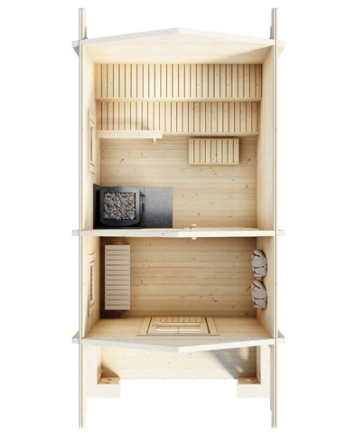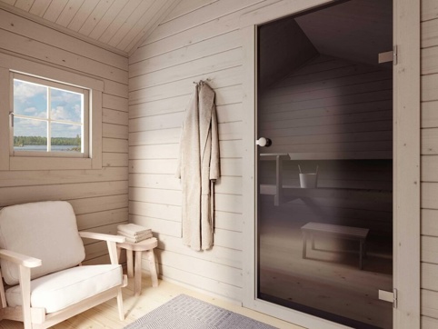 Luoman Tiira giver dig en sauna i haven, som har 2 rum – hvor det lille forrum har plads til at du kan pynte med sofa, planter m.m. for at skabe en afslappende og hyggelig stemning i rummet. Og den bagerste er hvor selve saunaovn, saunabænke m.m. skal placeres (ekskl.). Du kan med fordel tilføje et isbad, spabad, pool o.l. omkring huset og skabe et wellness-område i haven, hvor du og familien kan slappe af. Ovn og skorsten medfølger ikke.