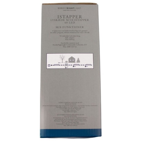 Gør det til en sjov tradition at samle familien og få opsat de flotte lyskæder. Her finder du denne lyskæde med i alt 10 istapper, som kan du skabe en hyggelig belysning – især i den mørke tid giver lyskæden en behagelig oplysning af f.eks. haven eller huset. Lyskæden har 40 LED, der lyser i et koldt hvidt lys. Du kan desuden bruge den både inden- og udendørs, da den har IP44-klassificering.