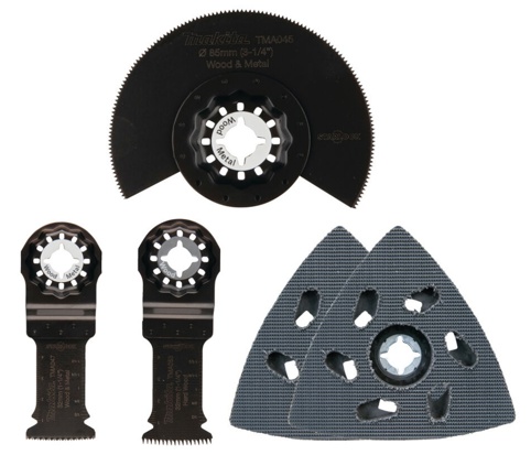 Dette klingesæt fra Makita er til multicuttere, hvor det er velegnet til tømrer- og gør-det-selv-arbejde. Klingerne kan samlet set skære i træ, krydsfiner, epoxy, aluminium og gipsplader. Sættet indeholder 3 forskellige klinger i størrelserne fra 32-85 mm samt 2 ens slibepuder med krog og løkke. Klingerne har Starlock, så de enkelt og nemt kan monteres.