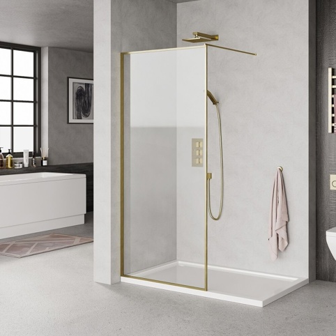 Elegant brusevæg med enkel og stilfuld aluprofil i oxideret messing