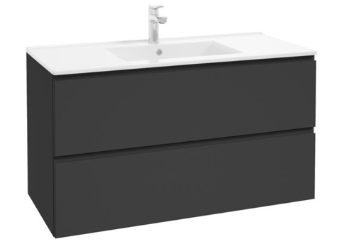 <h2>Et badmøbel i stilrent og enkelt design</h2><p>Dette tidløse badmøbel er til dig, der godt kan lide et stilrent design i høj kvalitet. Underskabet har en elegant overflade i antracit. Derudover følger der en vask i porcelæn med til kabinettet. Porcelæn er et utrolig holdbart materiale, som ikke let får ridser eller pletter. Vasken er slank i sit udseende og passer rigtig godt sammen med resten af møbelsættets look.<br><br>Underskabet har 2 skuffer, som gør det let at opbevare dine toiletting lige ved vasken og spejlet, hvor du skal bruge dem. Skufferne er uden greb og har soft-close-beslag. Du får derfor en lækker lydløs lukning, når du anvender dem. Skabet leveres færdigsamlet og klar til at blive hængt op. Armatur skal tilkøbes. Skabet kan fås i forskellige størrelser.</p><p><b>Forbehold vedrørende mål på vasken:</b><br>Vaskens mål kan variere med +/- 0,5 cm grundet produktionstolerancer. Vi anbefaler altid at kontrollere mål på både vask og møbel inden montering. Mindre afvigelser kan forekomme.</p>