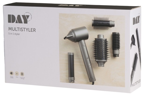 Multistyleren har en ledning med 360° drejefunktion, som giver maksimal bevægelsesfrihed, så du kan style håret fra alle vinkler, uden ledningen kommer i vejen. Den leveres med tilbehør, som er: halv børste, rund børste, hårtørrer, automatisk krøllejern og oval kam. Styleren leveres desuden med spray og UV-dekoration (detaljer, der bliver synlige ved ultraviolet lys), så du kan pleje og style dit hår på én gang.