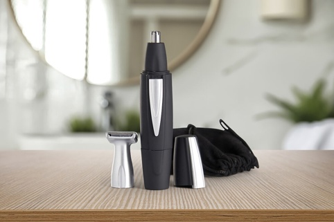 Denne næsehårstrimmer er et effektivt redskab til personlig pleje, der sikrer en nem og skånsom fjernelse af uønskede hår i næse og ører. Den har ét hastighedstrin og en ergonomisk soft touch-overflade, som gør, at den lægger behageligt i hånden, og du har fuld kontrol under brug. Trimmeren leveres med en praktisk øretrimmer, en rensebørste samt en opbevaringstaske, så den er velegnet til brug både hjemme og på rejser. Den bruger 1 x AA-batteri (ekskl.), hvilket gør den trådløs og nem at anvende overalt.