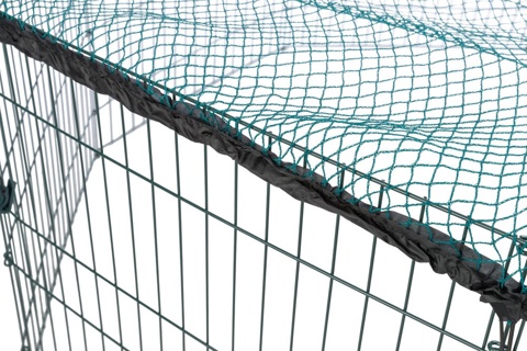 Praktisk overdækningsnet til kaninløbegårde uden tag. Nettet lægges over løbegården og hjælper med at holde kaninerne sikkert inde, så de ikke hopper ud uden opsyn, samtidig med at der bevares god ventilation.