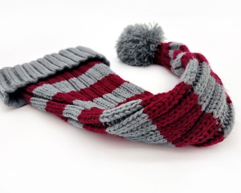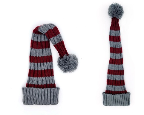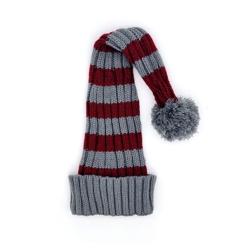 Her finder du en super-fin stribet nissehue, som er fremstillet i blødt, slidstærkt akrylgarn, der er ribstrikket. Nissehuen er 65 cm lang og onesize – men den kan passes af både børn og voksne, da den er elastisk. Brug den for at sprede julehumør i december, eller pak den ind til pakkeleg.