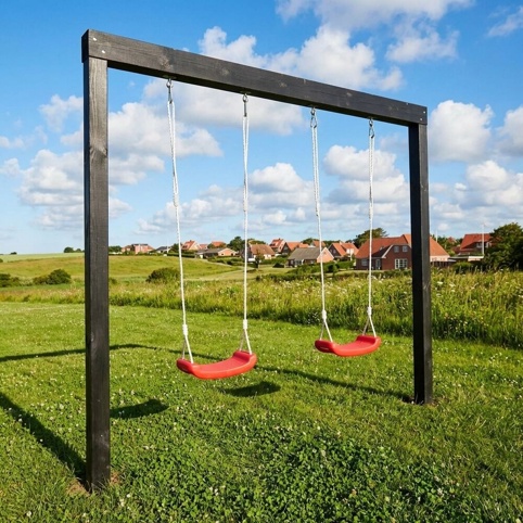 Skal legearealet opgraderes med et gyngestativ? Så kan du her finde dette fine Nordic Play Alfred-gyngestativ, som kan motivere dine børn til at bevæge sig under legen, som kan indarbejdes i deres legerutine. Det er i sortmalet træ, som giver produktet et moderne udtryk. Du kan forlænge holdbarheden ved at behandle gyngestativet med træbeskyttelse 1-2 gange årligt. Træet er PEFC-certificeret.