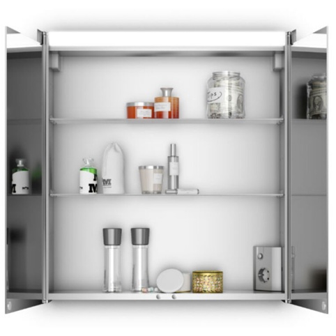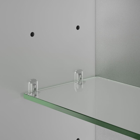 Inde i spejlet er der to justerbare glashylder, som du kan opbevare badeværelsesartikler og -tilbehør på. Derudover er der et strømstik, så du har strøm til din barbermaskine, føntørrer, eller hvad du nu bruger i dagligdagen.
