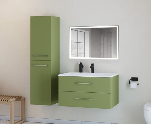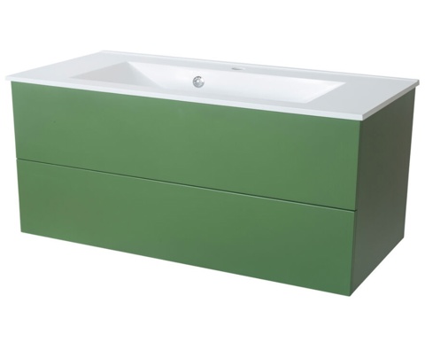 Møblet har en smuk støvet grøn farve, og det leveres uden forborede huller eller greb – du kan derfor sætte dit helt eget præg på badmøblet. Underskabet leveres færdigsamlet og har justérbare ophængsbeslag, der gør installationen nem og gør tilpasning af det ophængte møbel nemt og hurtigt. Håndvask skal købes separat.