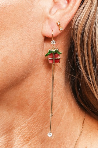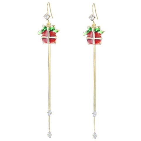 Her finder du disse super-flotte øreringe, hvor vedhænget er formet som julegaver, og de er pyntet med glitrende rhinsten og 2 lange guldfarvet kæder. Julehumøret vil kunne ses fra øre til øre med disse øreringe, og du kan med fordel bruge dem til julefrokost, juleaften eller blot som ekstra pynt i december måned. De er fremstillet uden nikkel, bly og cadmium – vi anbefaler ikke, at du udsætter dem for vand.
