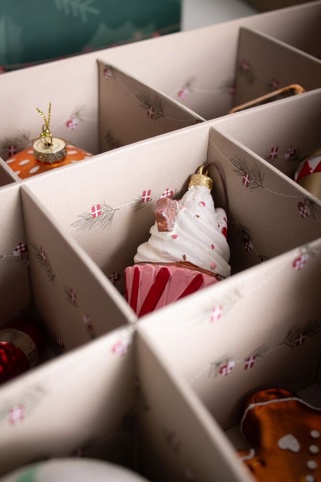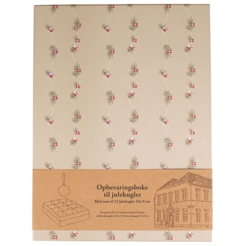 Med denne opbevaringsboks kan du opbevare og beskytte dine julekugler, når ikke de er i brug. I boksen er der plads til 12 julekugler, der har en diameter på 8 cm – har du flere, vil du nemt kunne stable kasserne ovenpå hinanden. Hvis i først pynter juletræet nær juleaften, så er boksen pyntet med et flot juledesign, som gør den kan stå fremme i hele december – indtil I pynter træet.