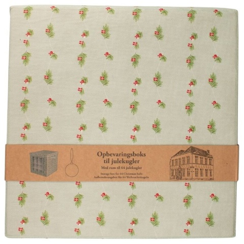 Med denne opbevaringsboks kan du opbevare og beskytte dine julekugler, når ikke de er i brug. I boksen er der plads til 64 julekugler i 4 lag – har du flere, vil du nemt kunne stable kasserne ovenpå hinanden. Hvis i først pynter juletræet nær juleaften, så er boksen pyntet med et flot juledesign, som gør den kan stå fremme i hele december – indtil i pynter træet.