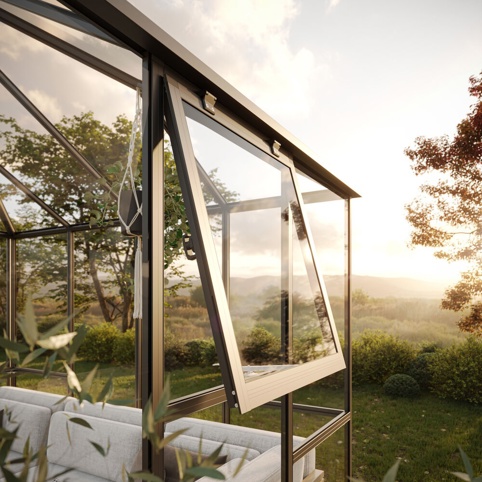 PaviLux er udført med gavle og tagudhæng, som giver et flot lysindfald og en robust løsning i hverdagen. Taget kan vælges i to varianter, alt efter om du ønsker et mere isolerende orangeriklima eller maksimal transparens og ekstra meget lys. Sidefelterne kan tilpasses, så du kan vælge mellem en bred dobbeltdør eller sidevinduer. Det giver mulighed for at indrette orangeriet efter, om du ønsker mere åben adgang og gennemgang – eller ekstra ventilation på varme dage.