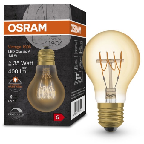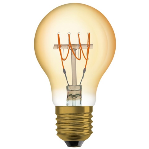 Pæren har klart glas og et guld-look – den er med flotte ultratynde spiral filamenter. Den er med E27-fatning og har en effekt på 4,8 W – som erstatter en traditionel pære med 35 W.