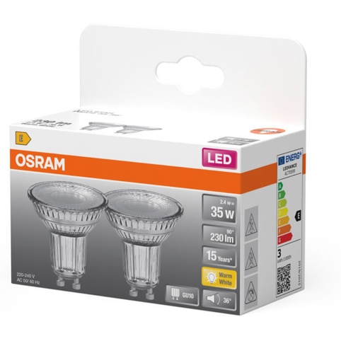 Har du brug for nye LED-spots? Her finder du en pakke med 2 stk. LED-spots, der har den klassiske GU10-fatning. Spottene har et lavt energiforbrug, da de kun bruger 2,4 W i drift, som er svarende til 35 W. Derudover lyser de med en varm hvid farve, idet de har en lysfarve på 2700 Kelvin og en lysstyrke på 230 lumen.
