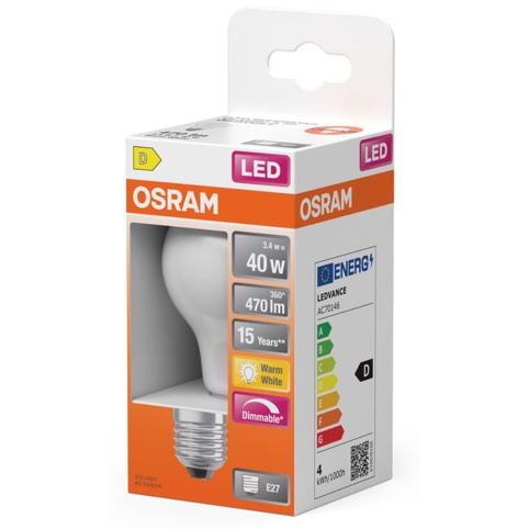 Er du på jagt efter en lavenergipære, som kan dæmpes? Så kan du her finde denne hvidmatteret LED-standardpære, som bruger 3,4 W i strøm, der er svarende til 40 W. Derudover har pæren en E27-fatning – også kendt som stor fatning. Standardpæren har et varmt hvidt lys, der er behageligt for øjet, da den har en lysfarve på 2700 Kelvin og en lysstyrke på 470 lumen.