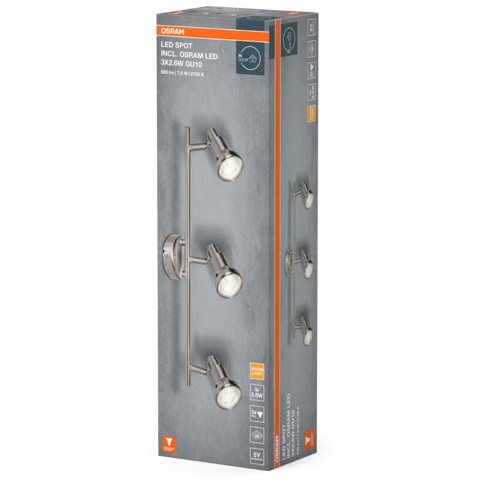 Spotlampen har GU10-fatninger, og den leveres med 3 x 2,6 W LED-lyskilder – der har en lysstyrke på 690 lumen og 2700 Kelvin, så du får en super-effektiv lampe. Lampen er fremstillet i aluminium, og overfladen er af børstet nikkel. Spotlampen måler L: 48,6 cm x B: 9 cm x H: 17 cm.