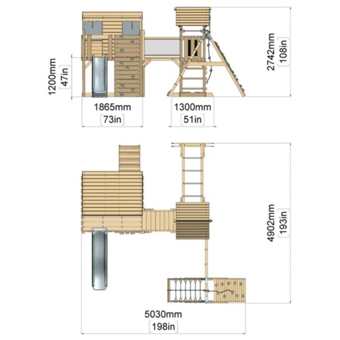 Legetårn med 2 platforme, bro, rutsjebane, armgang og klatrevæg