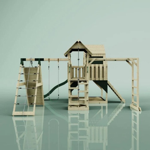 Trælegetårn med legehus, bro, rutsjebane, armgang og klatrevæg