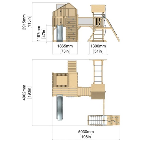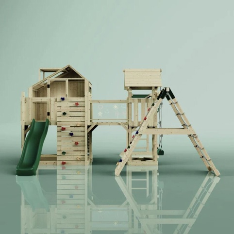 Tilføj dette fantastiske legetårn til haven og giv børnene en charmerende og rummelig trælegeplads, som giver dem deres helt egen verden af sjov, eventyr og fantasi. Legetårnet kombinerer to platforme – hvor den ene har et hyggeligt og åbent legehus, som indbyder til små pauser fra de vilde aktiviteter. En solid bro forbinder de to platforme og giver legen endnu en ekstra dimension. Til de mere aktive lege byder produktet på en spændende klatrevæg, armgang, et robust klatreelement med tov, en sjov bølgerutsjebane og en gynge, hvor børnene kan svinge sig frem og tilbage.