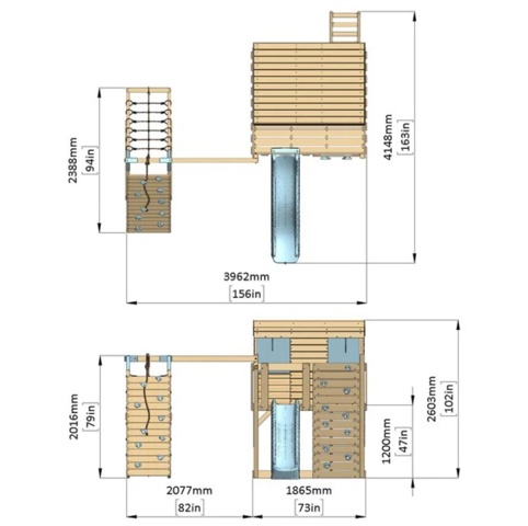 Legetårnet er fremstillet af ubehandlet træ, som kan have naturlige revner. Disse påvirker ikke konstruktionens styrke eller holdbarhed, men det er en naturlig del af materialet. Vi anbefaler, at du behandlet træet – så du undgår skader fra vejr og skadedyr. Denne behandling skal ske, inden det er samlet. Ved levering medfølger alle nødvendige dele, så du hurtigt kan gå i gang. Træet er ikke forboret.