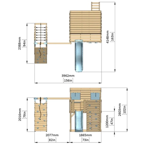 Legetårnet er fremstillet af ubehandlet træ, som kan have naturlige revner. Disse påvirker ikke konstruktionens styrke eller holdbarhed, men det er en naturlig del af materialet. Vi anbefaler, at du behandlet træet – så du undgår skader fra vejr og skadedyr. Denne behandling skal ske, inden det er samlet. Ved levering medfølger alle nødvendige dele, så du hurtigt kan gå i gang. Træet er ikke forboret.