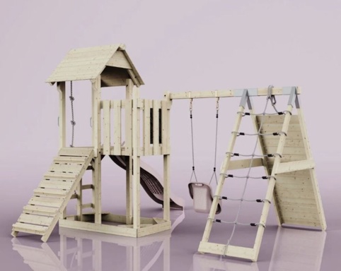 Giv børnene et sted i haven, hvor fantasien kan få frit løb, og hvor hver dag kan byde på nye eventyr! Med dette legetårn får børnene både et spændende klatremodul, en høj platform med rutsjebane, gynge og klatrereb – alt sammen samlet i én stor legeplads hjemme i haven. Under platformen kan I gøre plads til en sandkasse (ekskl. sand).