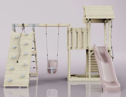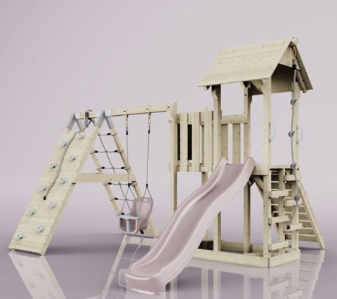 Legetårn med klatrevæg, gynge og rutsjebane – et helt legeland i haven