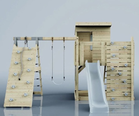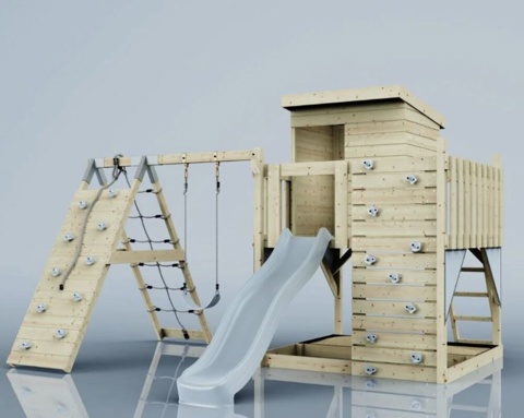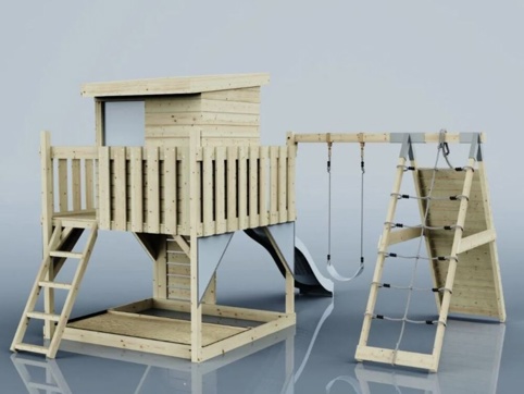Freja legetårnet er en komplet legeplads, der giver børn masser af muligheder for at lege, klatre og udfordre sig selv. Med både gynge, klatrevæg, klatrenet og rutsjebane får børnene en sjov og varieret legeoplevelse, som både styrker motorik, balance og fantasi. Under platformen kan Iigøre plads til en sandkasse (ekskl. sand). Legepladsen er perfekt til familiens yngste eventyrere, der elsker at kombinere aktiv leg med kreativ udfoldelse.