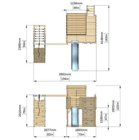 Klatrevæggen og -nettet giver en sjov og udfordrende adgang til legeprojektet, mens rutsjebanen sørger for en hurtig og nem udgang. Bagpå er der en trappe. Vær opmærksom på, at du bør fastgøre projektet med jordankre (ekskl.).