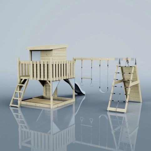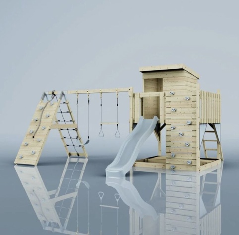 Frida legetårnet er en komplet legeplads, der giver børn masser af muligheder for at lege, klatre og udfordre sig selv. Med både gynger, klatrevægge, klatrenet og rutsjebane får børnene en sjov og varieret legeoplevelse, som både styrker motorik, balance og fantasi. Under platformen kan I gøre plads til en sandkasse (ekskl. sand). Legepladsen er perfekt til familiens yngste eventyrere, der elsker at kombinere aktiv leg med kreativ udfoldelse.