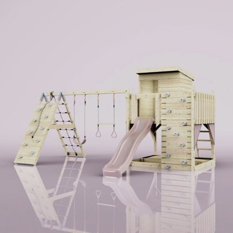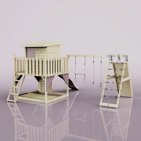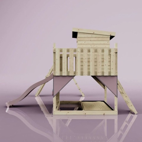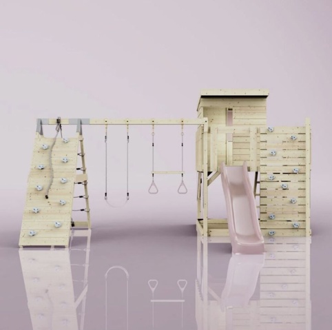 Frida legetårnet er en komplet legeplads, der giver børn masser af muligheder for at lege, klatre og udfordre sig selv. Med både gynger, klatrevægge, klatrenet og rutsjebane får børnene en sjov og varieret legeoplevelse, som både styrker motorik, balance og fantasi. Under platformen kan I gøre plads til en sandkasse (ekskl. sand). Legepladsen er perfekt til familiens yngste eventyrere, der elsker at kombinere aktiv leg med kreativ udfoldelse.