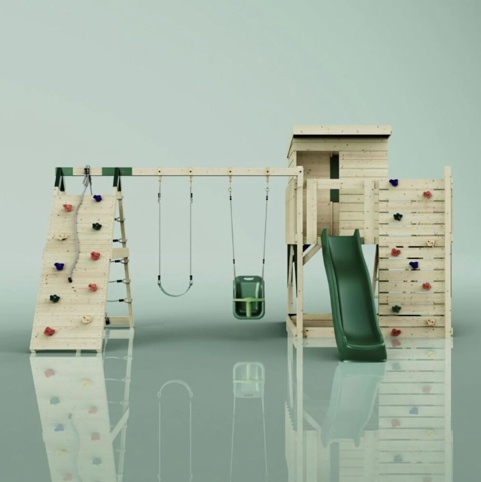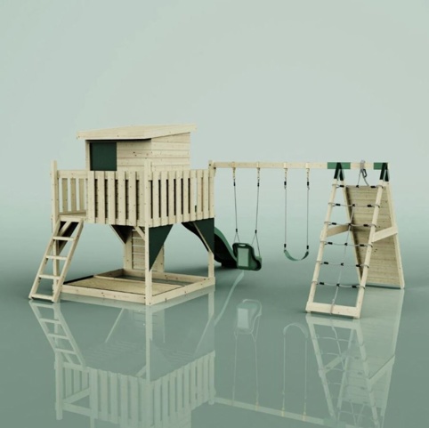 Frida legetårnet er en komplet legeplads, der giver børn masser af muligheder for at lege, klatre og udfordre sig selv. Med både gynger, klatrevægge, klatrenet og rutsjebane får børnene en sjov og varieret legeoplevelse, som både styrker motorik, balance og fantasi. Under platformen kan I gøre plads til en sandkasse (ekskl. sand). Legepladsen er perfekt til familiens yngste eventyrere, der elsker at kombinere aktiv leg med kreativ udfoldelse.
