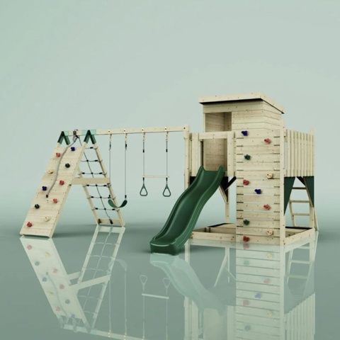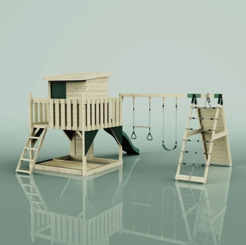 Frida legetårnet er en komplet legeplads, der giver børn masser af muligheder for at lege, klatre og udfordre sig selv. Med både gynger, klatrevægge, klatrenet og rutsjebane får børnene en sjov og varieret legeoplevelse, som både styrker motorik, balance og fantasi. Under platformen kan I gøre plads til en sandkasse (ekskl. sand). Legepladsen er perfekt til familiens yngste eventyrere, der elsker at kombinere aktiv leg med kreativ udfoldelse.