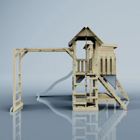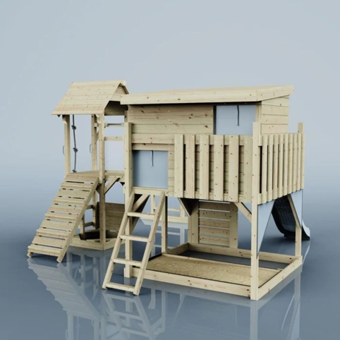 Denne variation sikrer, at børnene kan udfordre sig selv på mange forskellige måder – og samtidig styrke både motorik, balance og koordination gennem leg og bevægelse. Under platformen kan I med fordel lave en sandkasse (ekskl. sand). Legeprojektet er inkl. rutsjebane, klatresten, reb og ophæng.