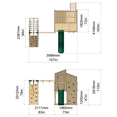 Legetårnet er fremstillet af ubehandlet træ, som kan have naturlige revner. Disse påvirker ikke konstruktionens styrke eller holdbarhed, men det er en naturlig del af materialet. Vi anbefaler, at du behandlet træet – så du undgår skader fra vejr og skadedyr. Denne behandling skal ske, inden det er samlet. Ved levering medfølger alle nødvendige dele, så du hurtigt kan gå i gang. Træet er ikke forboret.