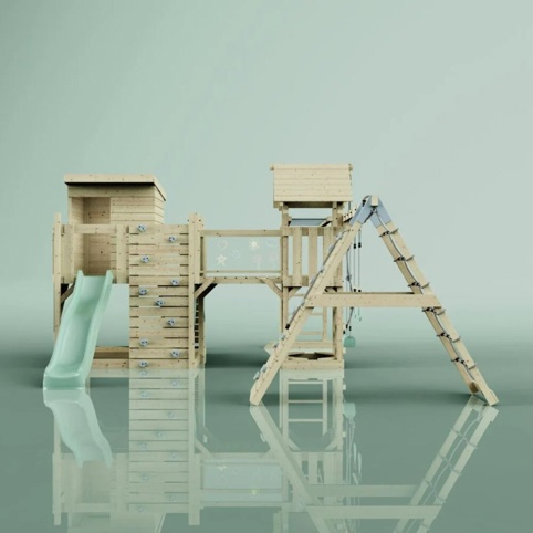 Denne variation sikrer, at børnene kan udfordre sig selv på mange forskellige måder – og samtidig styrke både motorik, balance og koordination gennem leg og bevægelse. Under platformen kan I med fordel lave en sandkasse (ekskl. sand). Legeprojektet er inkl. gynger, rutsjebane, klatresten, reb og ophæng.