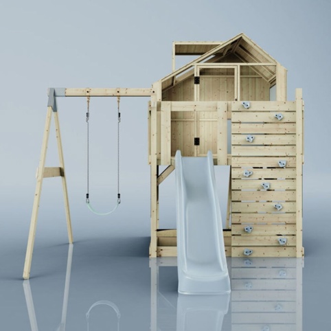 Skab et aktivt og fantasifuldt legeområde i haven med dette flotte legetårn. Her kan børnene bestige klatrevæggen, svinge frem og tilbage på gyngen og suse ned ad den bølgeformede rutsjebane igen og igen. På toppen venter et rummeligt legehus med vinduer, der lukker masser af lys ind – perfekt til at bygge hule, så de kan holde pauser fra de vilde aktiviteter.