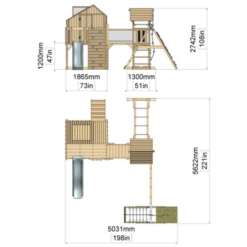 Tilføj dette fantastiske legetårn til haven, og giv børnene en charmerende og rummelig trælegeplads, som giver dem deres helt egen verden af sjov, eventyr og fantasi. Legetårnet har to platforme – hvor den ene har et rummeligt legehus med højt til loftet, od det indbyder til små pauser fra de vilde aktiviteter. Legetårnet byder også på en rutsjebane, klatrevæg, stige, gynge- og klatremodul samt en bro, der forbinder de to tårne. Den store variation sikrer, at børnene kan lege på mange forskellige måder.