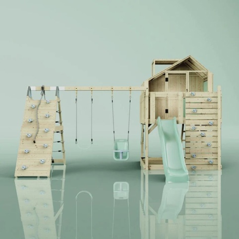 Forvandl haven til en komplet legeplads med dette store og alsidige legetårn. Her kan børnene klatre op ad stigen, suse ned ad den sjove bølgerutsjebane, gynge frem og tilbage eller udfordre sig selv på klatrevæggen og klatrenettet. Når der er brug for en pause fra de vilde lege, kan børnene trække sig tilbage til det hyggelige legehus på platformen – perfekt til hemmelige huler og små pauser.