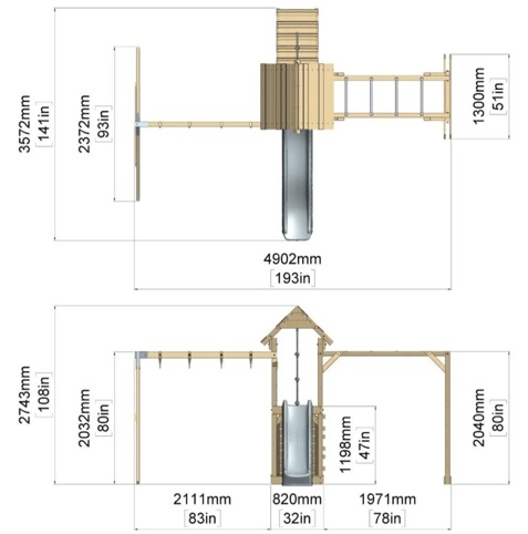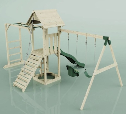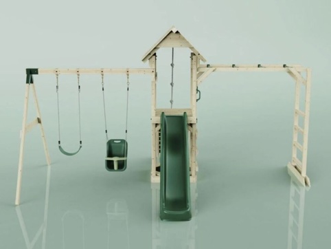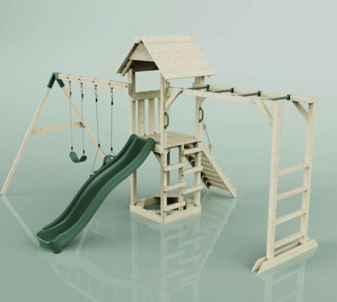 Forvandl haven til et eventyrligt legeområde med dette store legetårn, der kombinerer klatring, rutsjebane og gynger i én samlet løsning. Med en platform i 120 cm højde, en bølgeformet rutsjebane og flere forskellige klatremuligheder får børnene masser af muligheder for leg og bevægelse. På hver side af tårnet finder du enten et gyngestativ med 2 gynger eller en armgangsforhindring.
