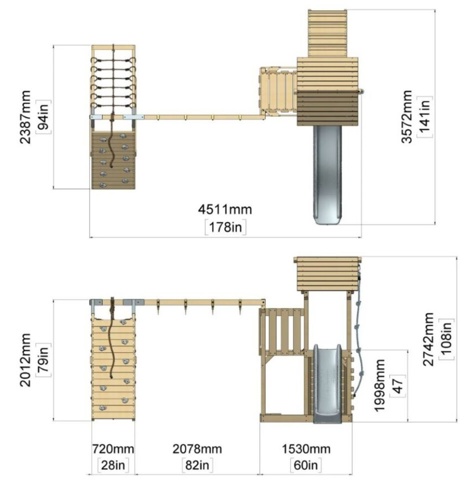 Legetårnet har en stabil konstruktion af ubehandlet træ samt pulverlakerede og galvaniserede svingophæng, som er højdejusterbare. Produktet er godkendt til privat brug, og der er inkluderet en rutsjebane og gynger. Målene på produktet er L: 451 cm x B: 357 cm x H: 274 cm. Tårnet er velegnet til børn fra 3-10 år, og det kan kapere en maks. belastning på 50 kg pr. person. Platformshøjden er 120 cm. Der er 4 stk. jordankre inkluderet.