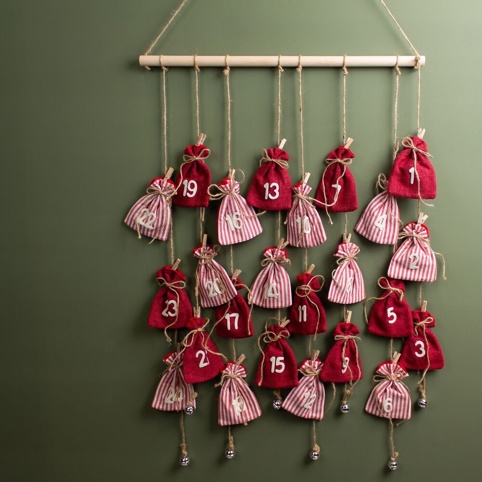 Ingen jul uden en pakkekalender. Du får her en pakkekalender, hvor der hænger 24 små poser i rød og hvid med tallene fra 1-24 ned fra en stabil pind. Ophænget kan altså hænges op på en væg, så poserne hænger ned langs væggen. Hver dag kan den, du har kær, åbne en lille gave eller andet sødt, som vil gøre de mørke vintermorgener lidt lysere og ventetiden mere sød.
