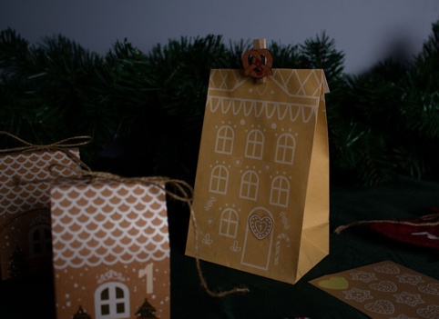 Hvis du laver kalendergaver til dine børn, så kan du købe denne pakkekalender, som du kan sætte dit eget præg på. Fold poserne ud og fyld dem med søde og sjove gaver, som du har købt til dine børn – på den måde har du mulighed for at tilpasse pakkekalenderen til dine børns præferencer. Posen har et fint peberkagehus-design, der vil sprede julestemning, uanset hvor de står, indtil de er åbnet. Poserne er ideelle til at placere i en kurv.