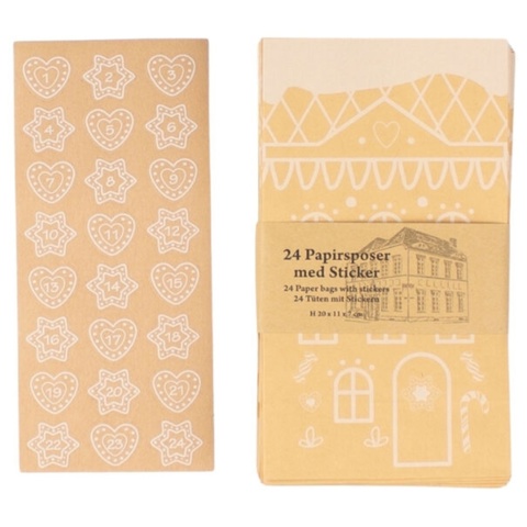 Når I skal holde styr på, hvilke papirposer der er til hvilken dag, så kan du sætte klistermærkerne med tal på. Du får nemlig klistermærker med tallene 1 til 24 med hertil. Desuden er de af kraftpapir, og hver pose måler B: 11 cm x D: 7 cm x H: 20 cm. Produktet er FSC®-mærket.